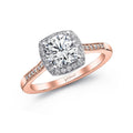 This stunning ring features a cushion-shaped white gold halo with fine pave set diamonds, and a rose gold shank decorated with pave diamonds. Standard size created for a 1 ct center stone.