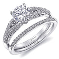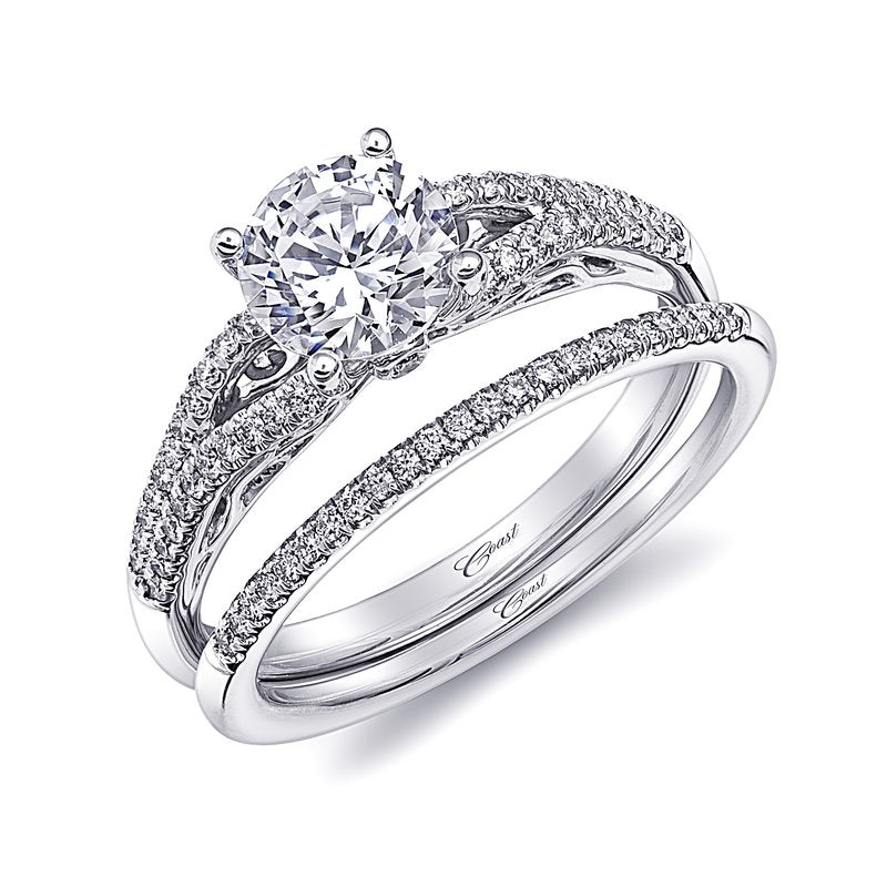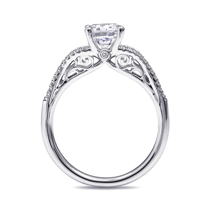A modern engagement ring with vintage flair, featuring a diamond encrusted split shank with ornate filigree in the gallery. Shown with a 1 ct center stone. Band sold separately.