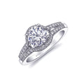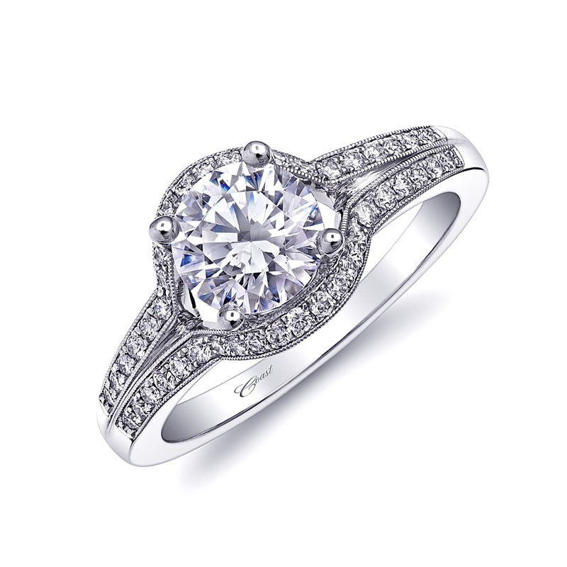 This beautiful engagement ring features two rows of pave set diamonds which split to curve around a 1 ct center stone.