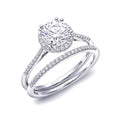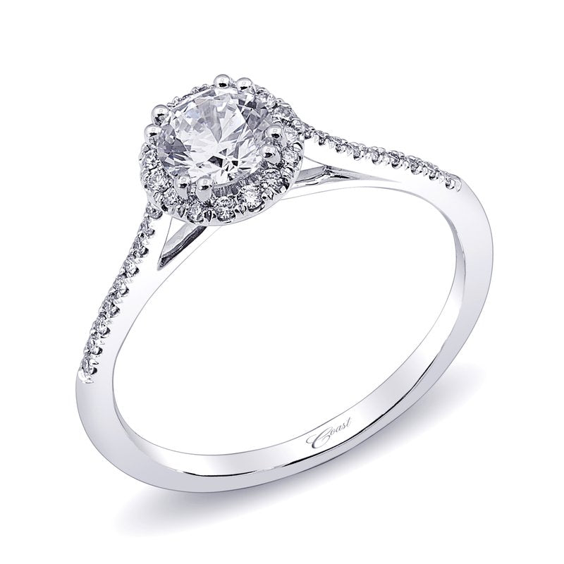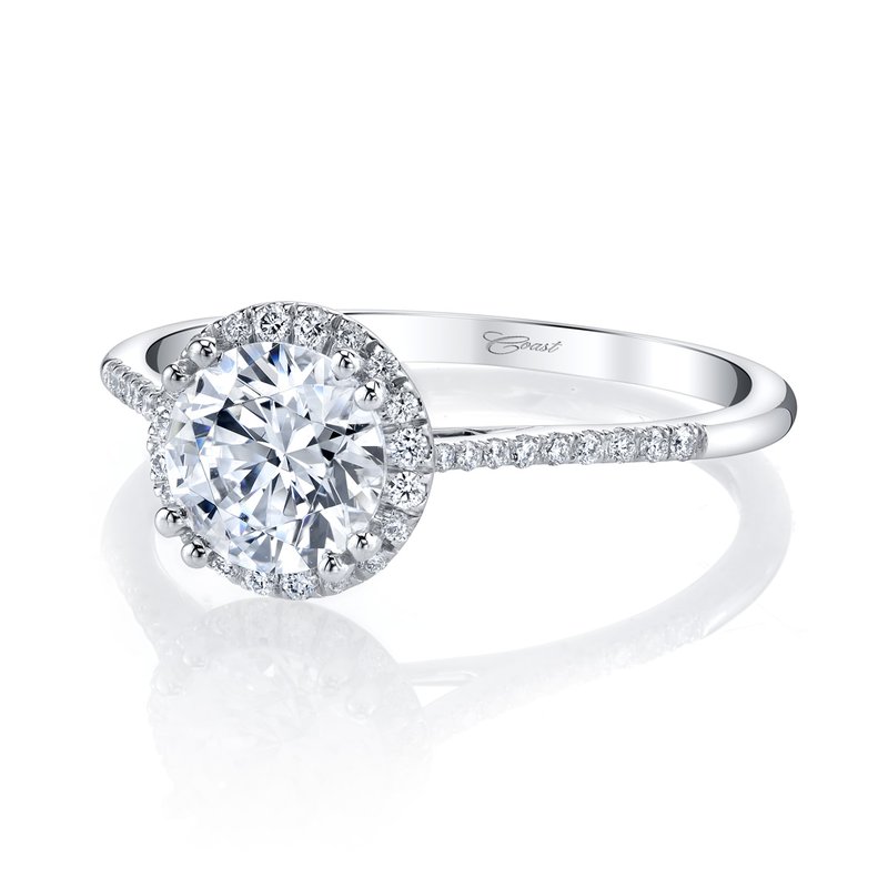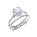 This delicate and attractive engagement ring features a round center stone accented by a round halo of diamonds. Petite prong set diamonds decorate the shoulders of the ring as well as the matching band. Band sold separately.