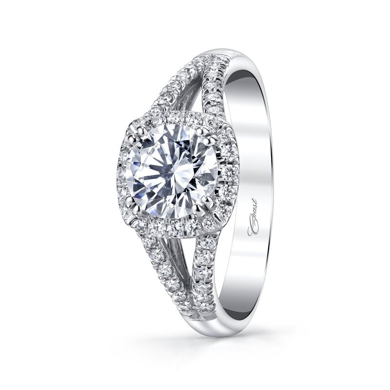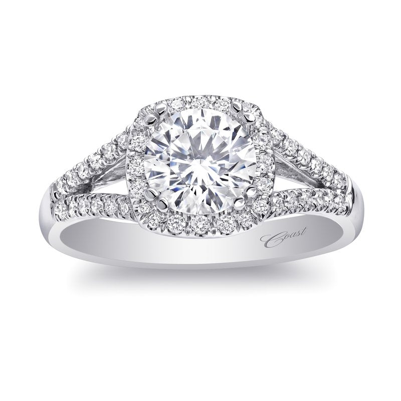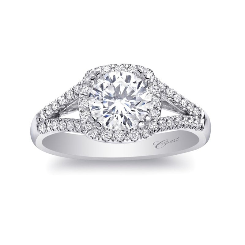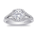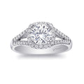 A modern halo design with a diamond-encrusted split shank make this ring an all-time favorite.