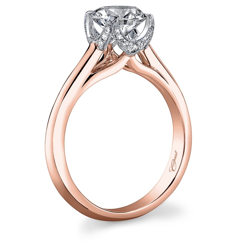 This two-tone rose and white gold ring features a crown-like setting for the center stone and a highly polished rose gold shank. Petite pave set diamonds surround the center stone. Standard size created for a 1 ct center stone.