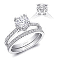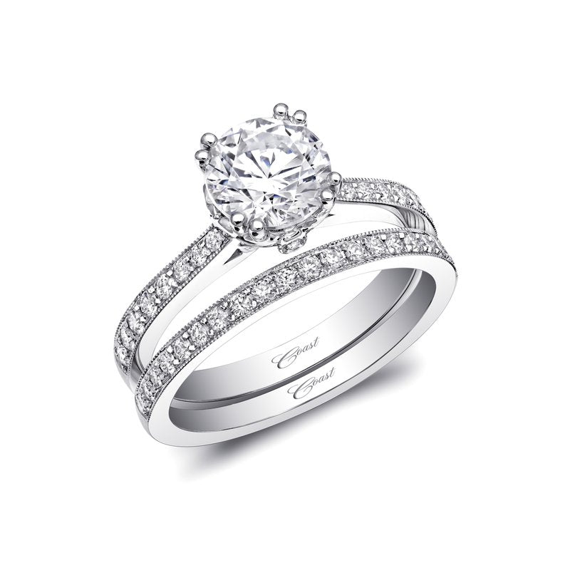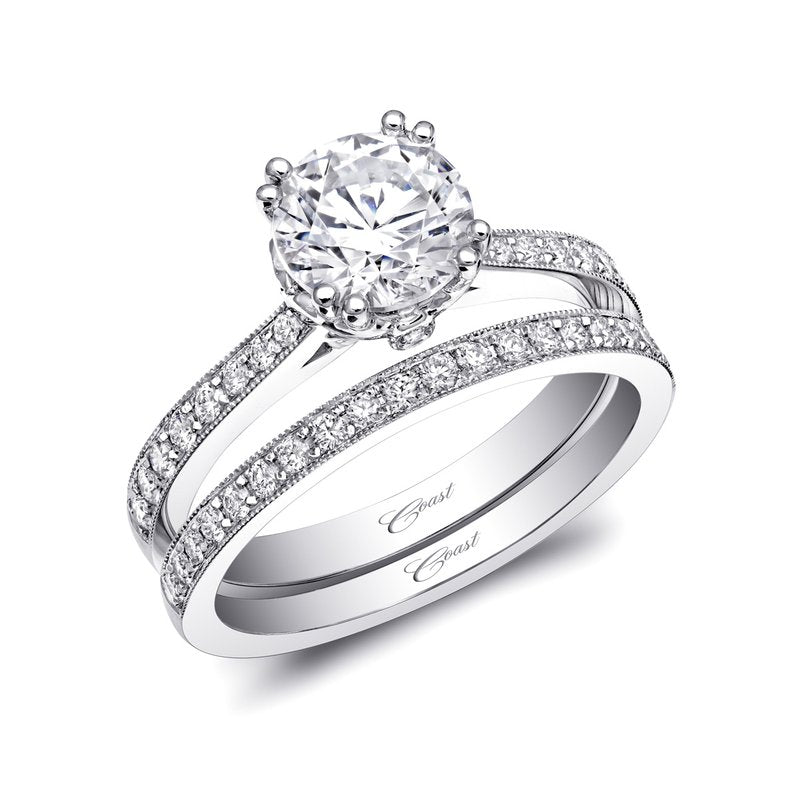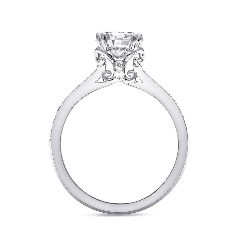 A gorgeous design from the Romance Collection, this ring features an ornately designed center head, accented by pave diamonds on the shoulders of the ring. Standard ring created for a 1 ct center stone. Band sold separately.