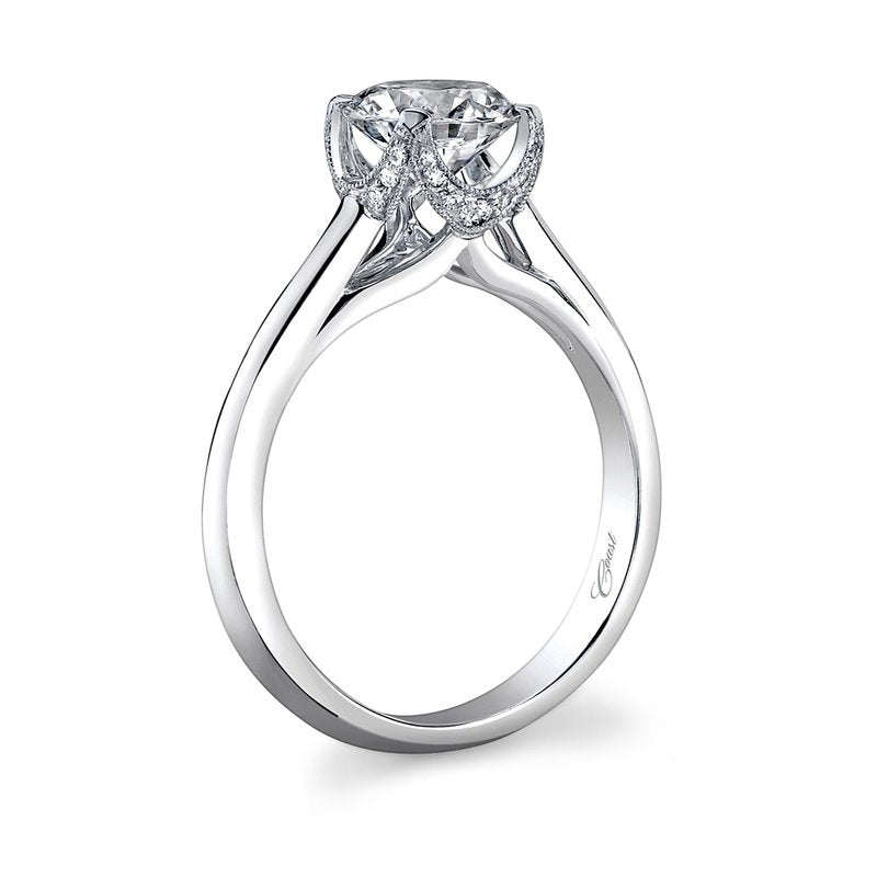 An enduring classic that will last a lifetime, this solitaire ring is adorned with pave diamonds in a crown-like setting. Standard size created for a 1 ct center stone.