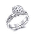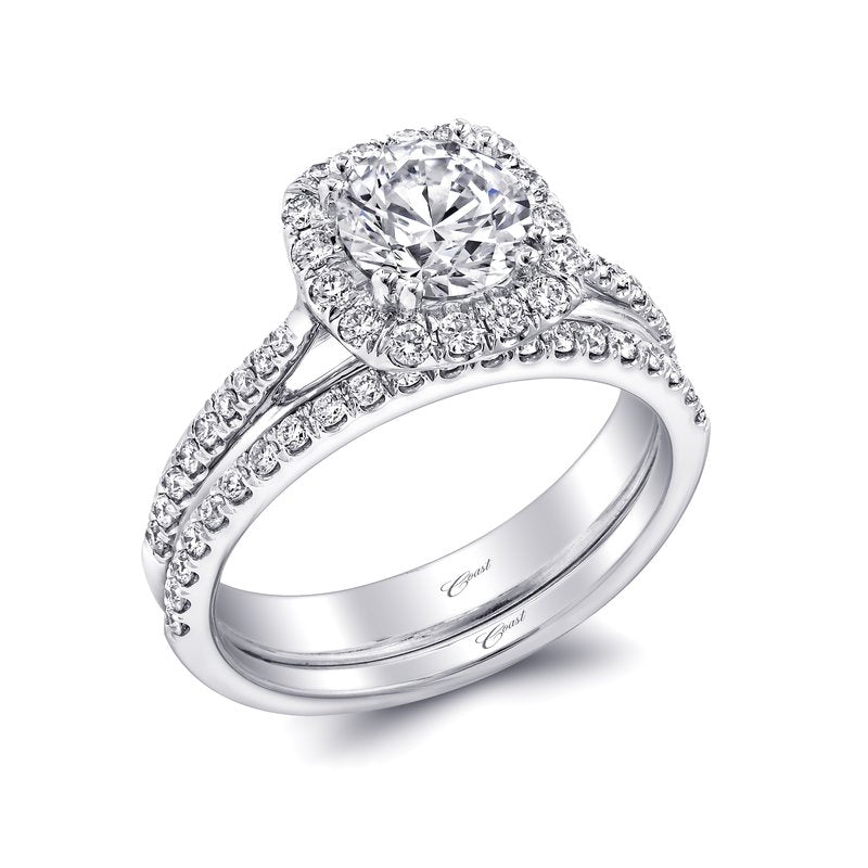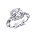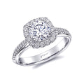 An attractive cushion shaped halo frames this round center stone. Diamonds cascade down the shoulders of the ring complimenting this sweet and subtle halo design.