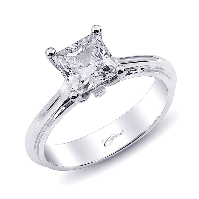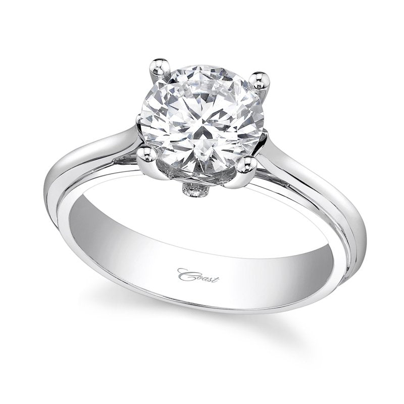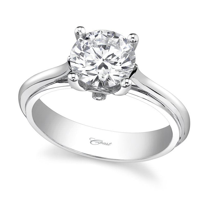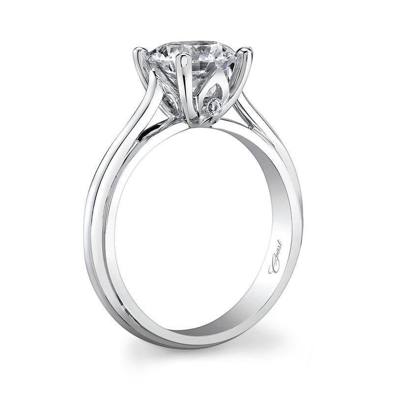 In this classic design, a high-polished shank contrasts the sparkling center stone. The center stone is set in an elegant 4 prong setting with floral design elements and a peek-a-boo diamond. Created for a 1.5 ct center stone in 18K white gold.
