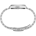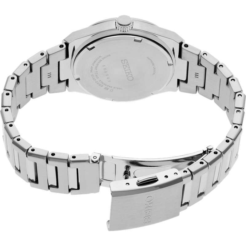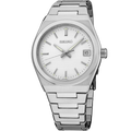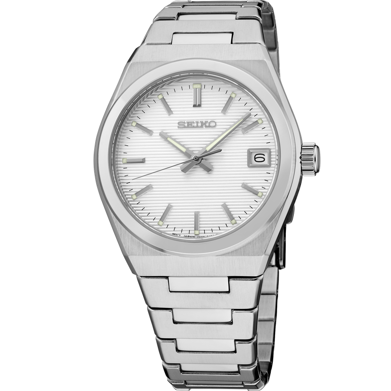 From the Essentials Collection. A modern take on a classic style, this elegant watch features a sleek, angular case and bracelet design perfect for both dress occasions and everyday wear. The silver pressed pattern dial showcases simple silver stick indices for a contemporary feel and includes a date calendar and LumiBrite hands and markers. Crafted of stainless steel with a scratch-resistant sapphire crystal, this versatile timepiece is equipped with a secure screwdown caseback and tri-fold push button release clasp. 10 bar, 100M Water Resistant