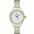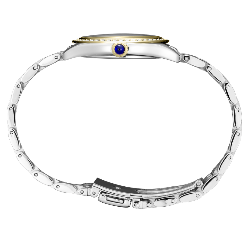 From the Crystal Collection. Inspired by jewelry design, this elegant watch is styled to be perfect for both everyday and special occasion use. With dazzling Swarovski® crystals framing a patterned white dial with stylized Arabic numerals and distinctive blue hands, this versatile timepiece is crafted of stainless steel with two-tone finish and includes a classic cabochon crown. 5 bar, 50M Water Resistant. Swarovski® is a registered trademark of Swarovski® AG.
