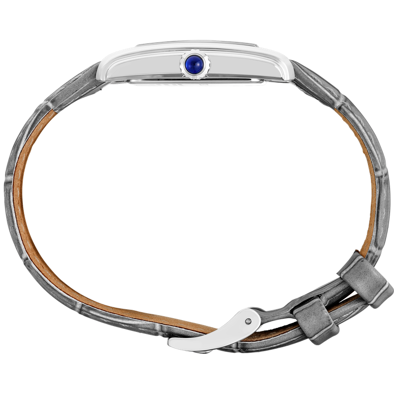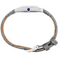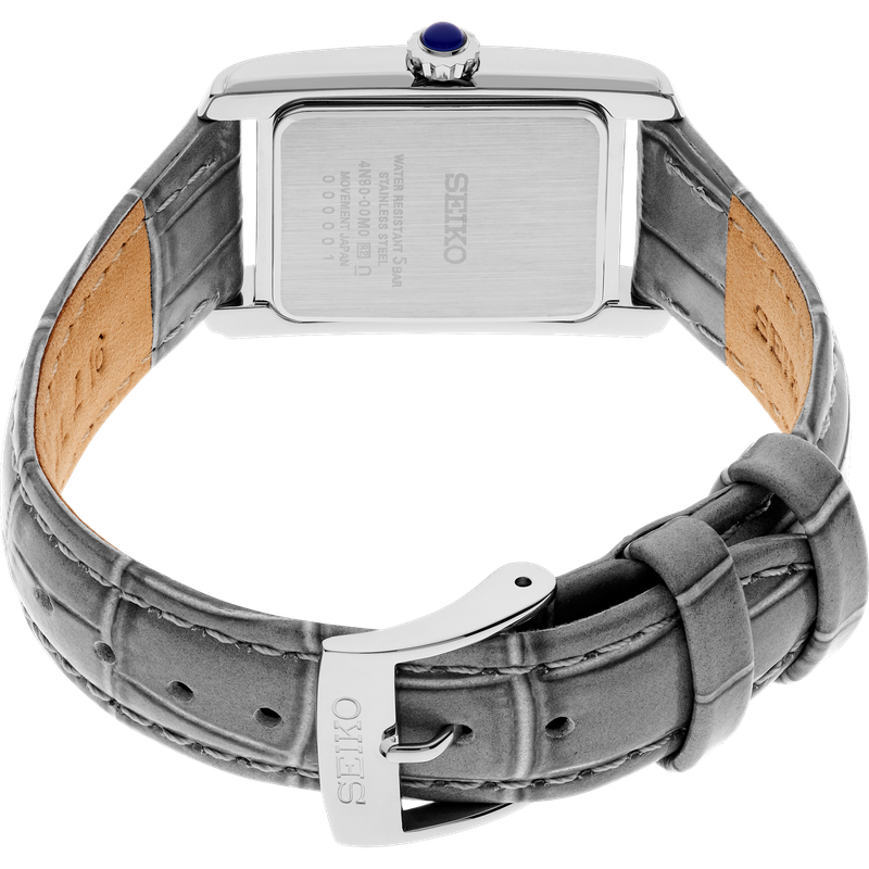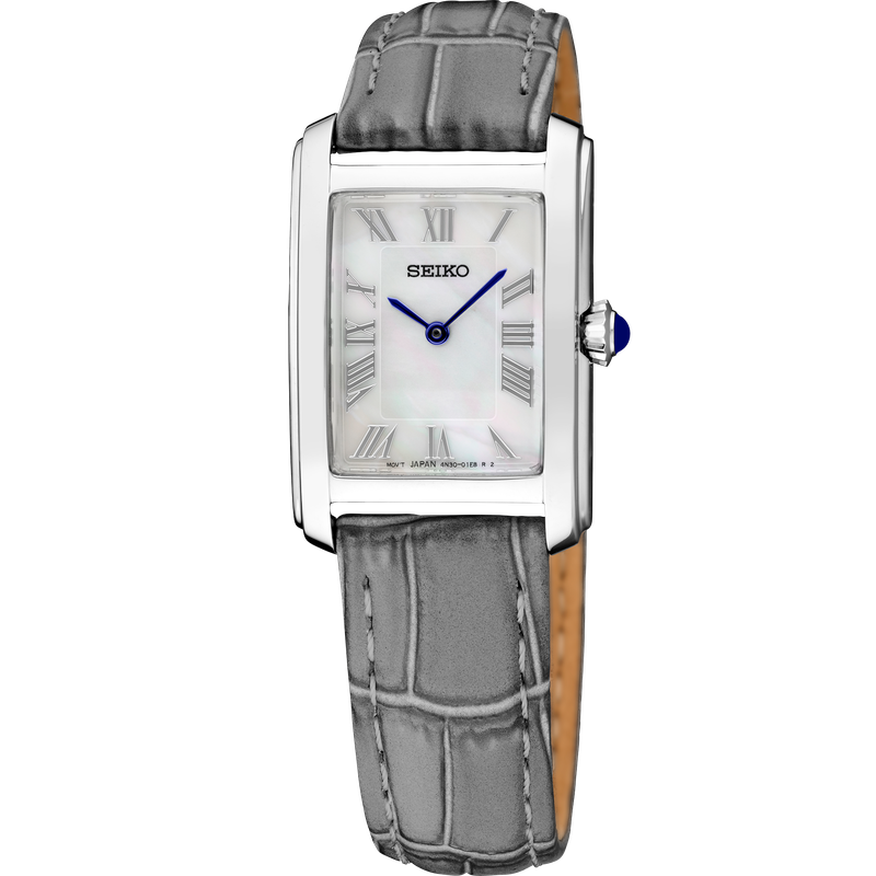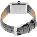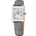 From the Essentials Collection. A contemporary classic, beautifully proportioned for a streamlined feel, this elegant watch offers a white mother-of-pearl Roman numeral dial, blue hands, and a blue cabochon crown. With a sleek rectangular case crafted of stainless steel, the graceful design includes a soft gray leather strap for superb comfort and sophisticated style. 5 bar, 50m Water Resistant