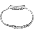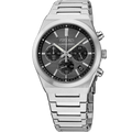 From the Essentials Collection. A modern take on a classic style, this contemporary watch features a sleek, angular case and bracelet design perfect for both dress occasions and everyday wear. The gray pressed pattern dial showcases three subdials, simple stick indices, a date calendar, and LumiBrite hands and markers. Crafted of stainless steel with a scratch-resistant sapphire crystal, this versatile timepiece is equipped with a chronograph function that measures up to 60 minutes of elapsed time in 1/5 second increments and includes a secure screwdown caseback and tri-fold push button release clasp. 10 bar, 100M Water Resistant