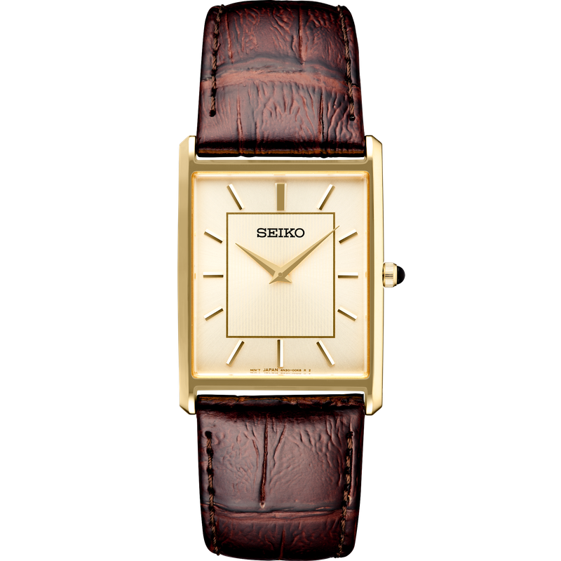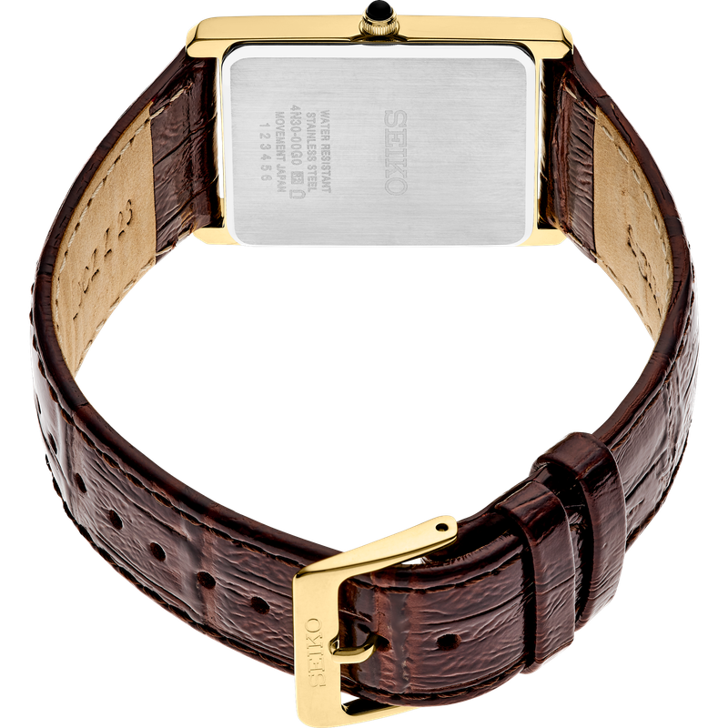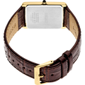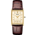 From the Essentials Collection. Offering classic dress/sport design, the Essentials Collection provides the ideal solution for everyday wear. Giving a new slant to a traditional rectangular style with a subtly patterned light champagne sunray dial, this perfectly tailored watch features a stainless steel case in gold finish, cabochon crown and textured brown leather strap. 3 bar, 30M Water Resistant