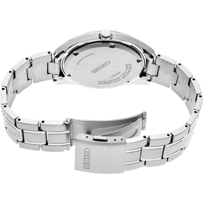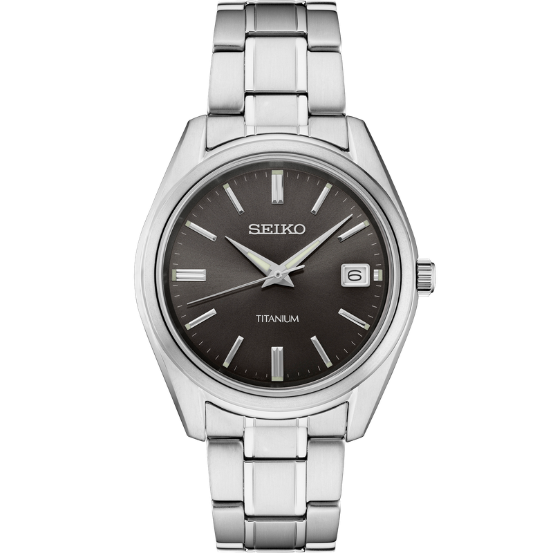 From the Essentials Collection. Offering classic dress/sport designs, the Essentials Collection provides the ideal solution for everyday wear. Crafted of durable and light-weight titanium, this perfectly tailored watch features a contemporary minimalist black sunray dial with date calendar, for a superb blend of clarity and wearability. The sapphire crystal adds superior scratch resistance. 10 bar, 100M Water Resistant