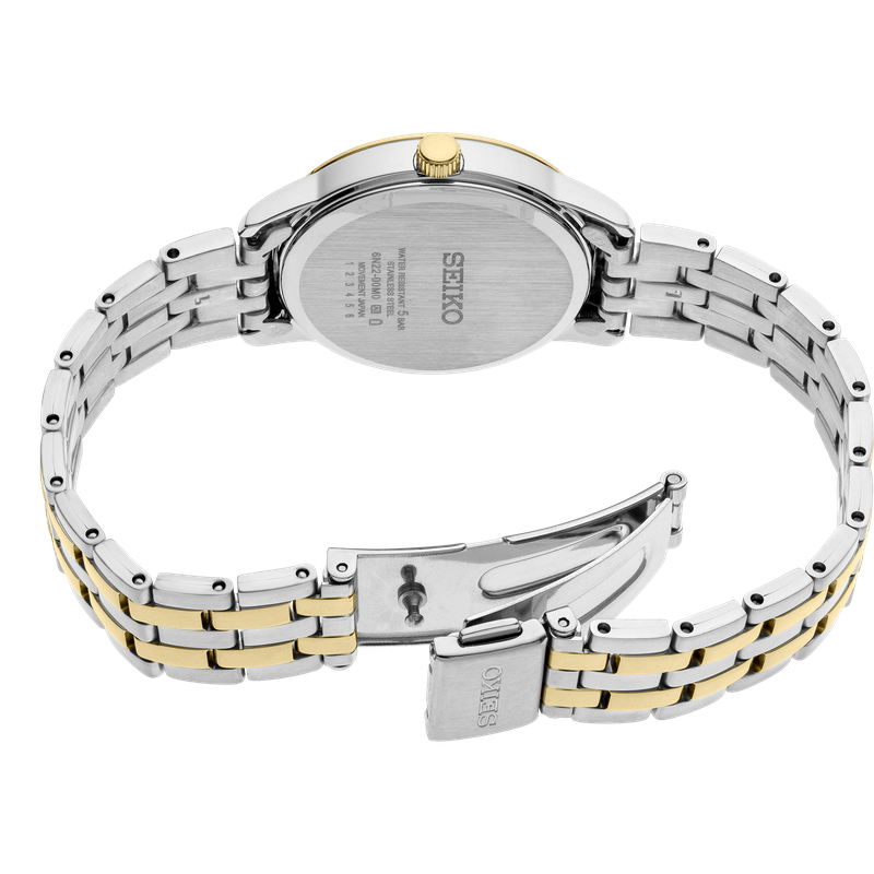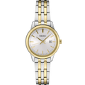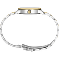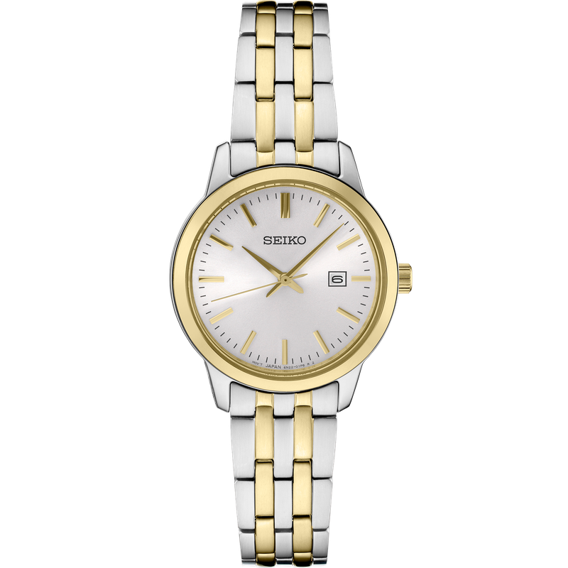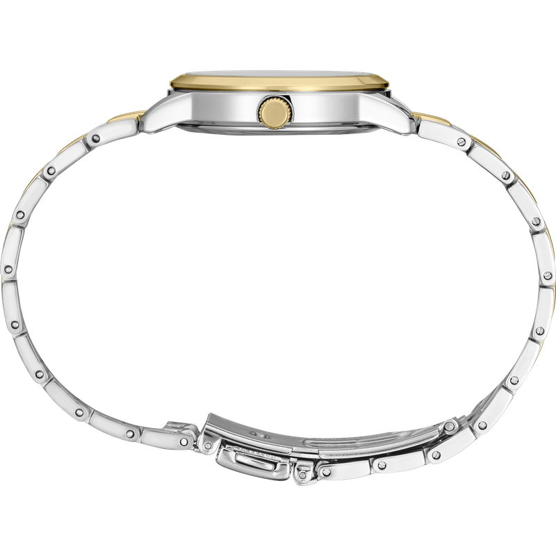 From the Essentials Collection. Offering classic designs, the Essentials Collection provides the ideal solution for all-day wear. Crafted of stainless steel in versatile two-tone finish, this perfectly tailored watch features a contemporary minimalist white dial with gold hands and markers, as well as a date calendar, for a superb blend of clarity and style. 10 bar, 100M Water Resistant