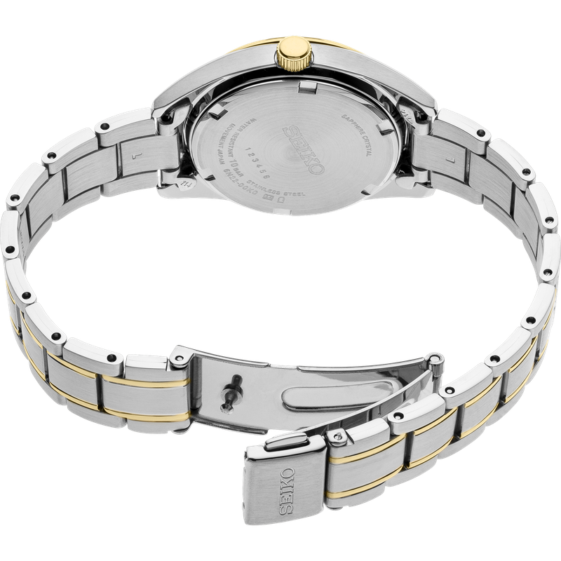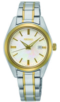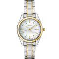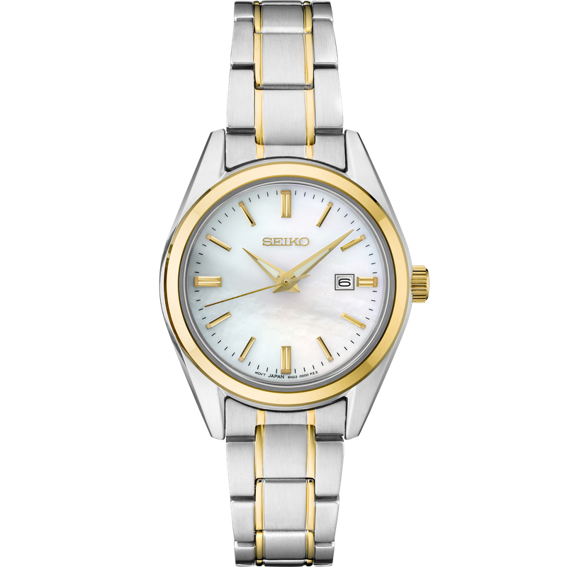 From the Essentials Collection. With classic dress/sport styling, this perfectly tailored design combines sophisticated minimalism with versatility. The elegant mother-of-pearl dial features a date calendar and LumiBrite hands. In stainless steel with two-tone finish, and sapphire crystal for superior scratch resistance. 10 bar, 100M Water Resistant