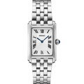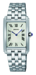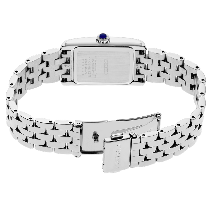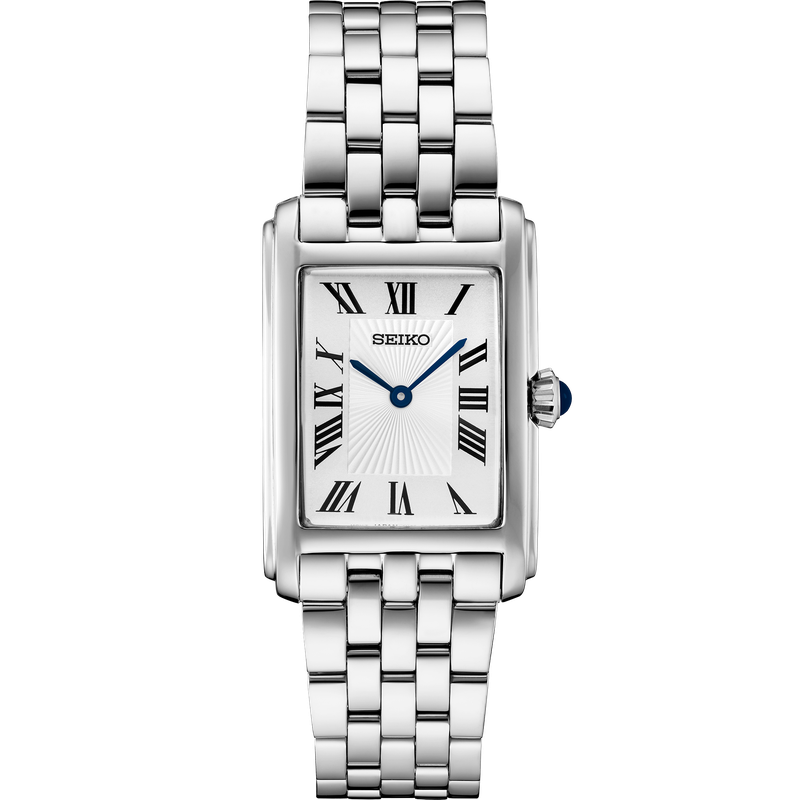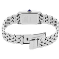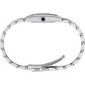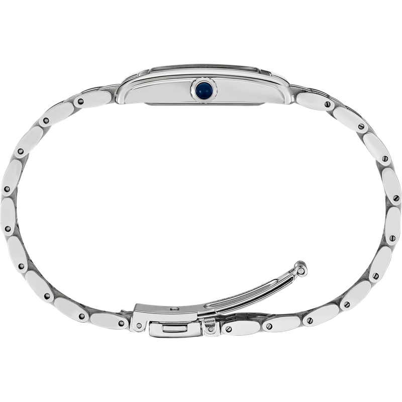 From the Essentials Collection. A sophisticated classic, perfectly proportioned for a jewelry-like feel, this elegant rectangular case watch offers a patterned white Roman numeral dial, blue hands and a blue cabochon crown. Crafted of stainless steel, this graceful design includes a five-row stainless steel bracelet for sleek wearing comfort, and a tri-fold push button release clasp. 5 bar, 50m Water Resistant