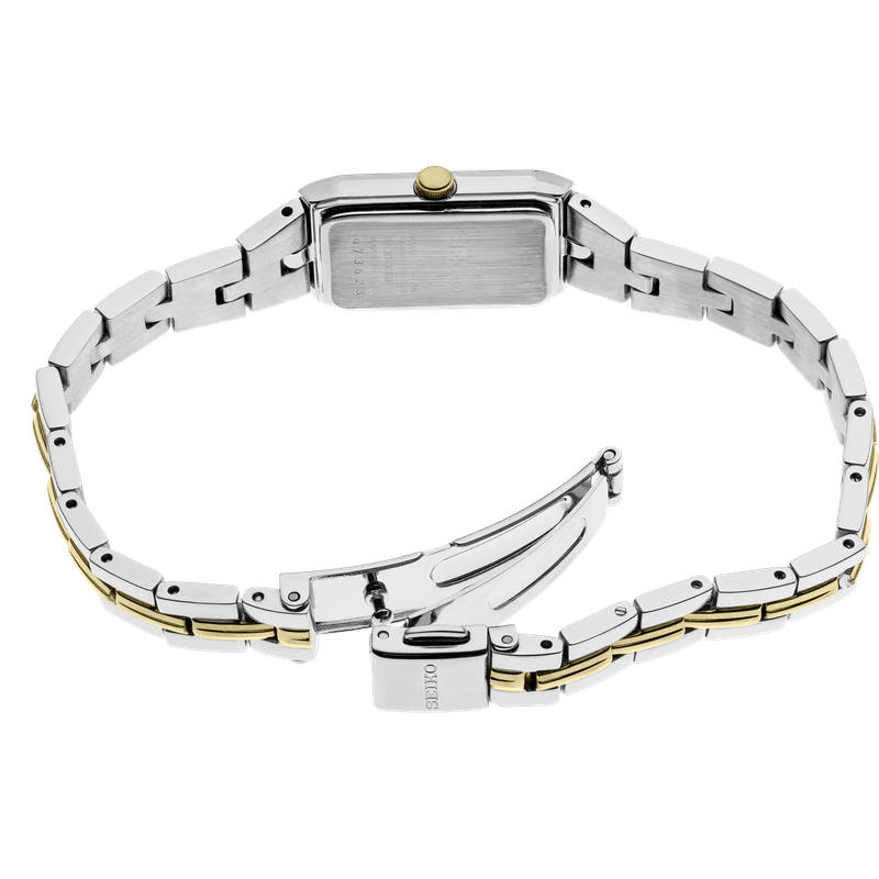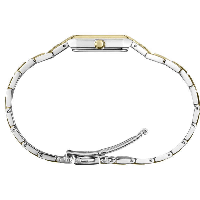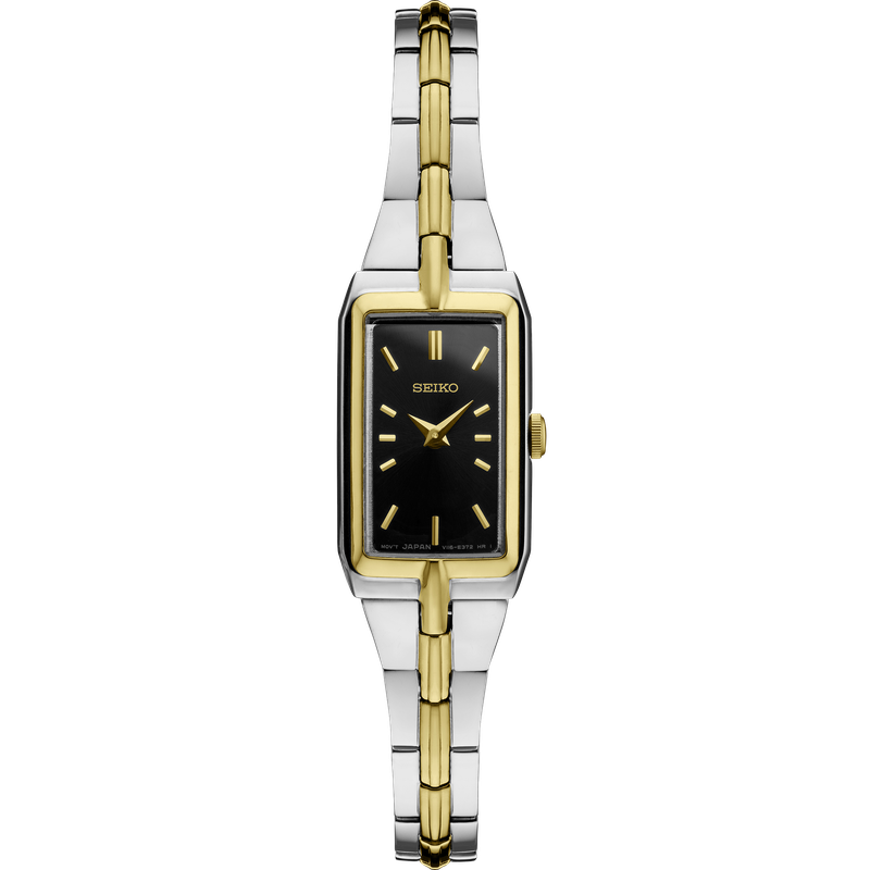 From the Essentials Collection. Inspired by jewelry design, this elegant watch is styled to be perfect for both every day and special occasions. Featuring a black dial with gold accents, this sophisticated timepiece is crafted of stainless steel with two-tone finish. 3 bar, 30M Water Resistant