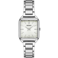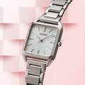 From the Essentials Collection. With a fresh square case design, this light and slim watch is proportioned for a perfect fit. The silver-white die-stamped grid pattern dial and subtly textured markers add a hint of sophisticated luxury. Crafted of stainless steel with tri-fold push button release clasp. 5 bar, 50M Water Resistant