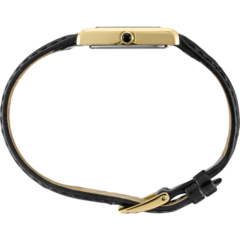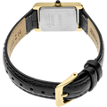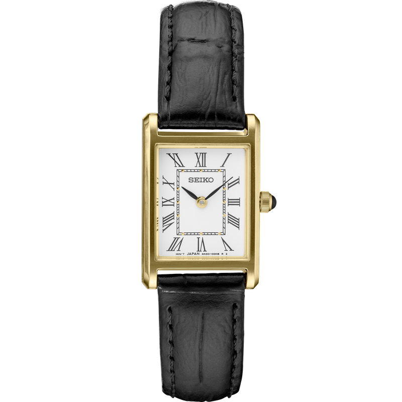 From the Essentials Collection. Offering classic designs, the Essentials Collection provides the ideal solution for everyday wear. Crafted of stainless steel in gold-tone finish, this elegant watch, with sophisticated rectangular case, features a traditional white dial with Roman numerals and finely shaped hands, cabochon crown and black leather strap for perfect day-to-evening style. 3 bar, 30M Water Resistant