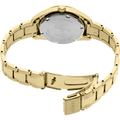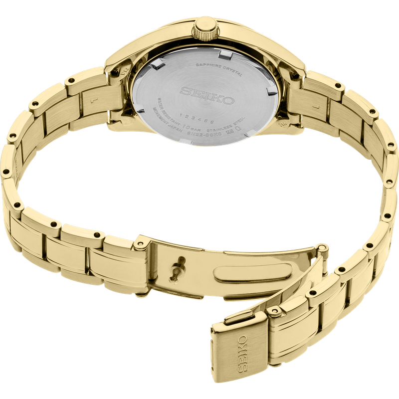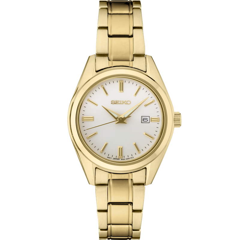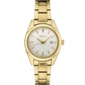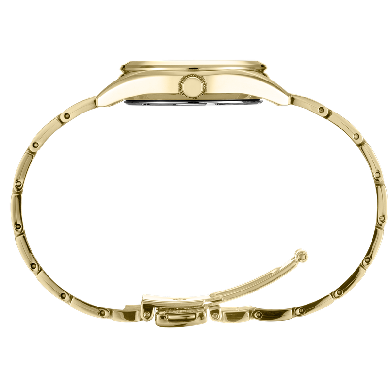 From the Essentials Collection. With classic dress/sport styling, this perfectly tailored design combines sophisticated minimalism with versatility. The silver sunray-finish dial features a date calendar and LumiBrite hands. In stainless steel with gold finish, and sapphire crystal for superior scratch resistance10 bar, 100M Water Resistant