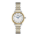 Silver patterned dial with Arabic numeralsBlue hour and minute handsCabochon crownCase diameter: 29.6mmTwo-tone stainless steel case and braceletWater-resistant to 5 bar, 50 meters (165 feet)Caliber 7N00
