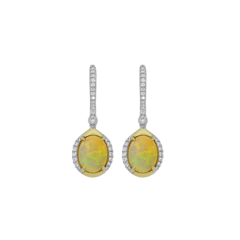 Spark Creations 18k yellow & white gold opal & diamond earrings with 2 - oval opals weighing 2.60 carats and 56 - round brilliant cut diamonds weighing .32 carats with a color of F/G and a clarity of VS1