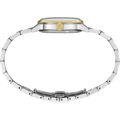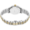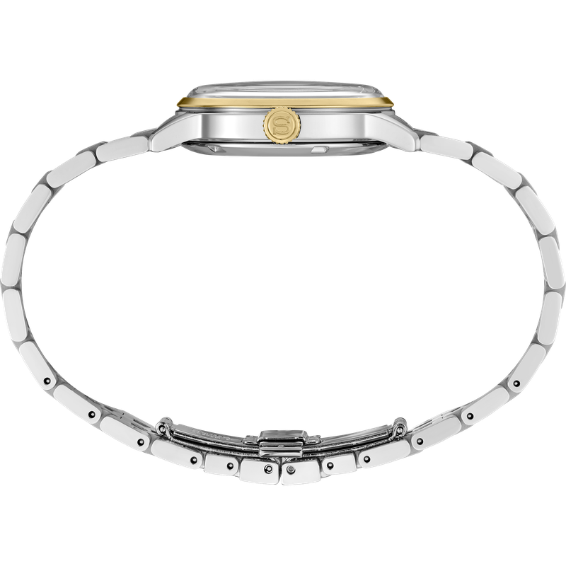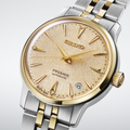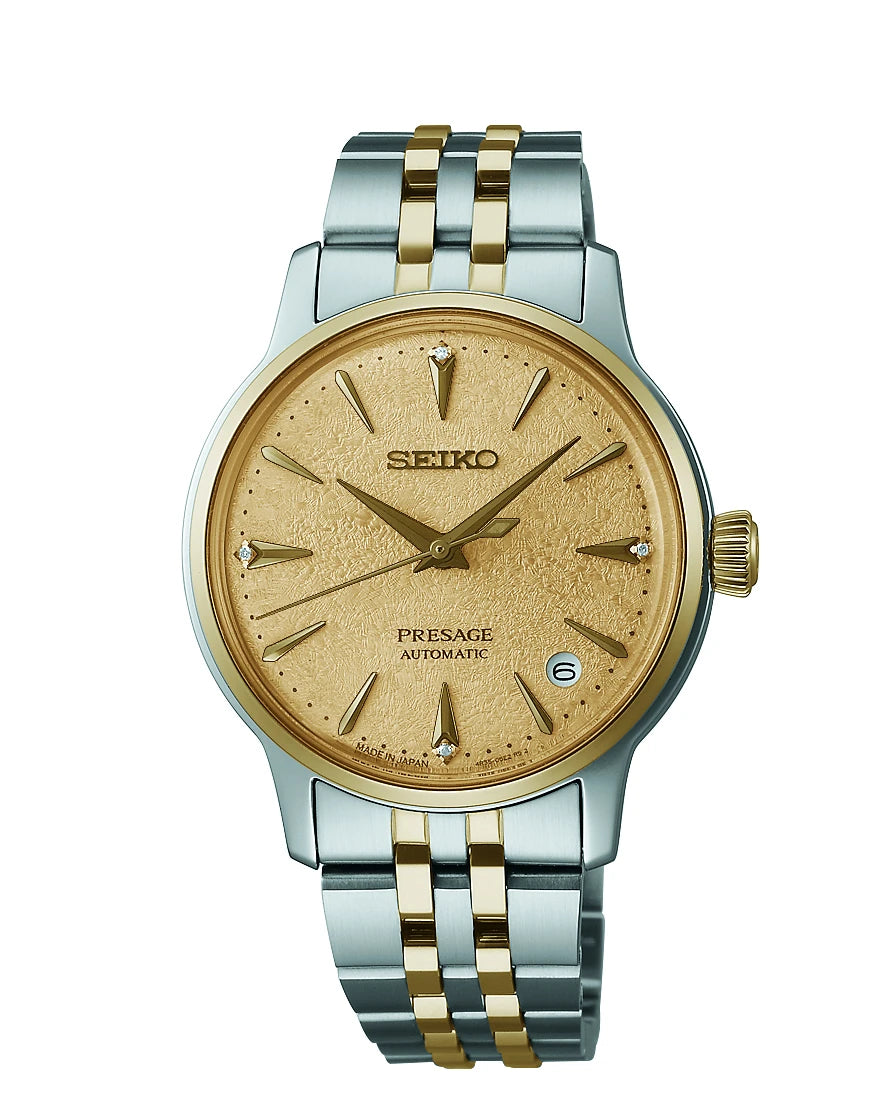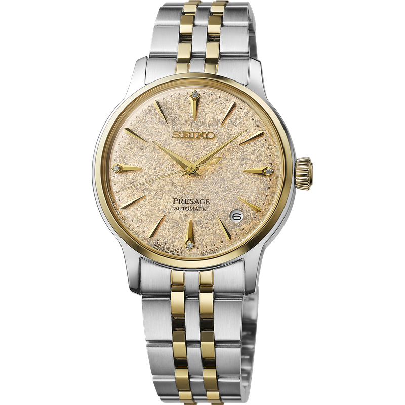 Seiko Presage Cocktail Time. Offering the finest in Japanese mechanical watchmaking, the Presage Collection blends precision technology with superior craftsmanship and design. Offering a graceful and fresh twist to the popular Cocktail Time series, this charming watch, inspired by the Frozen Banana Daiquiri cocktail, features a lovely light champagne dial. With a stunning pressed pattern evoking crunchy ice. Four diamonds, artfully incorporated into the signature wedge-shaped markers at 12, 3, 6, and 9 o’clock, add a luxurious sparkle. The streamlined case houses a 23-jewel automatic movement, which beats at a frequency of 21,600 vibrations per hour, with a power reserve of approximately 41 hours and manual winding capability. Crafted of stainless steel with a gold two-tone finish and a delicately tapered bracelet, this distinctive timepiece includes a date calendar, box-shaped crystal, screwdown caseback, and deployment clasp with push-button release. 5 bar, 50M Water Resistant
