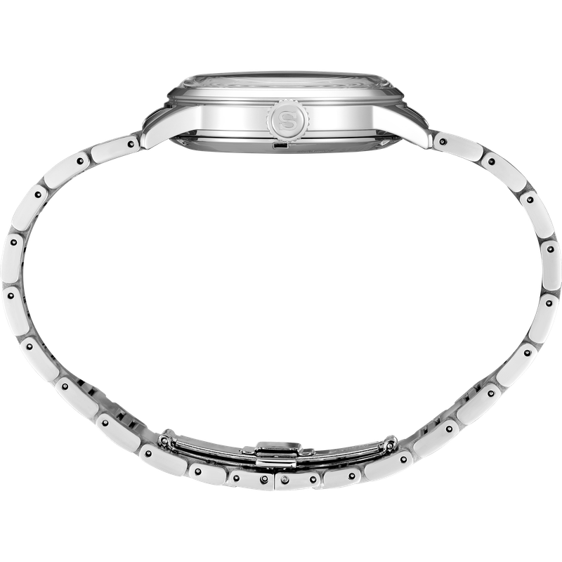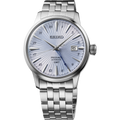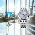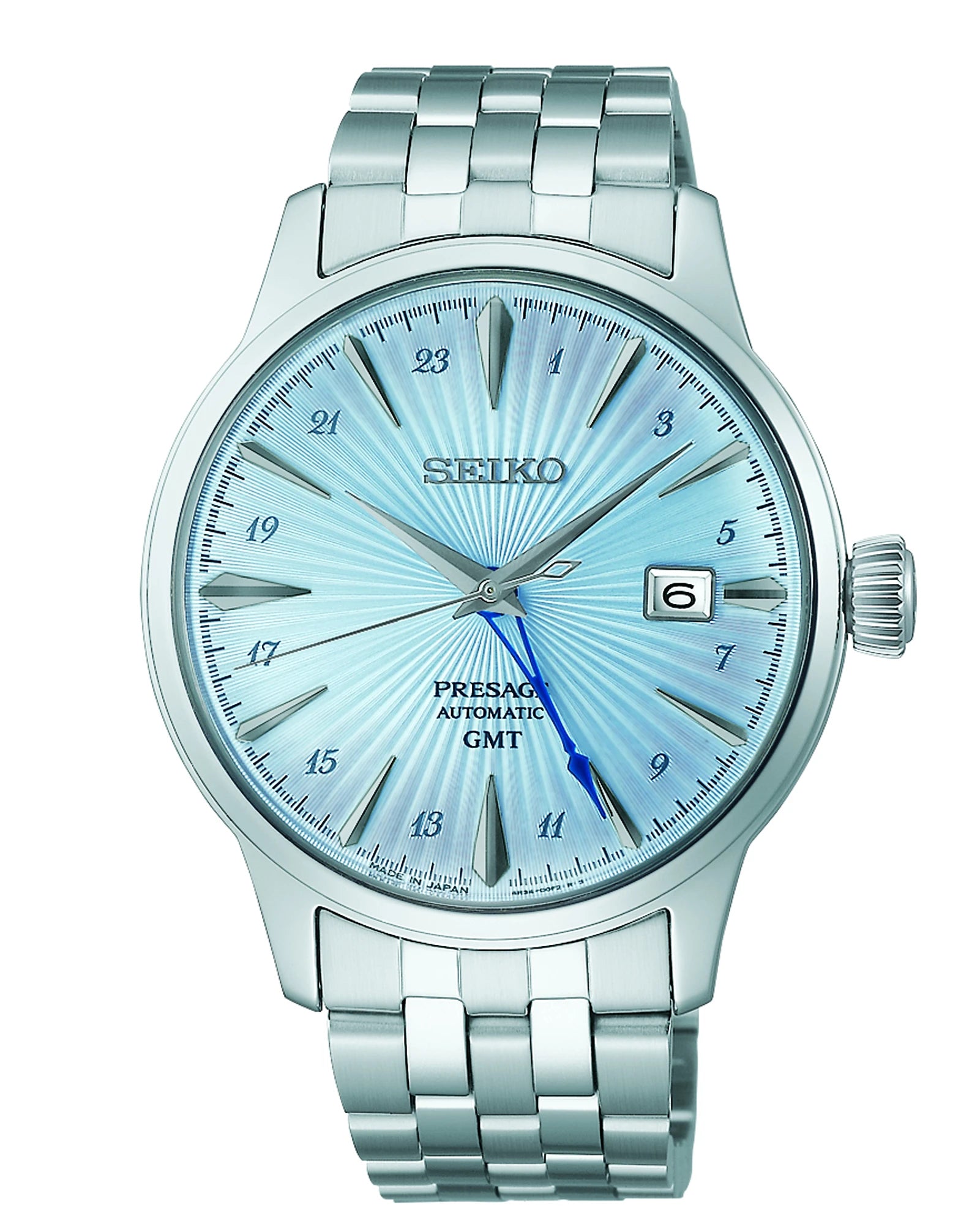 Presage Cocktail Time GMT. Offering the finest in Japanese mechanical watchmaking, the Presage Collection blends precision technology with superior craftsmanship and design. Inspired by the vibrance of the city’s modern lounges, the newest Cocktail Time designs express the excitement of today’s Tokyo, with fresh styling and colors. Evoking the Skydiving cocktail, the light blue dial features a deep pressed pattern with a lustrous gloss finish accented with a vibrant blue GMT hand designed in the shape of a cocktail glass, while beautifully displaying a cursive-style Arabic numeral 24-hour scale. The 24-jewel automatic GMT movement, visible through the screwdown see-through caseback, beats at a frequency of 21,600 vibrations per hour with a power reserve of approximately 41 hours. Crafted of stainless steel, this distinctive timepiece includes a date calendar, box-shaped crystal, and deployment clasp with push button release. 5 bar, 50M Water Resistant