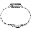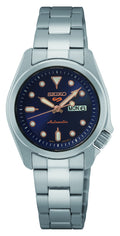 Seiko 5 Sports Collection. With street-smart design, this new, smaller Seiko 5 Sports timepiece offers an updated take on vintage styling for both durability and all-day versatility. Providing automatic technology that you control with every movement, this distinctive watch is powered by a 21-jewel movement that beats at a frequency of 21,600 vibrations per hour, with a power reserve of approximately 40 hours and manual winding capability. Framed by a 60-minute track marked in five-minute increments, the navy blue sunray finish dial features a day/date calendar, and luminous hands and markers. Crafted of stainless steel, this effortlessly fashionable watch includes a screwdown caseback and tri-fold push button release clasp. 10 bar, 100M Water Resistant