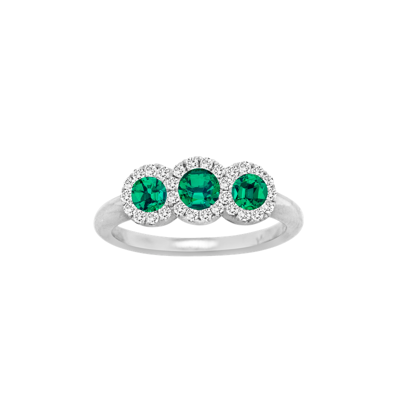 Spark Creations 18k white gold three stone emerald and diamond ring with 3 round emeralds weighing 0.54 carats and 30 round brilliant cut diamonds weighing 0.21 carats with a color of G and a clarity of VS1