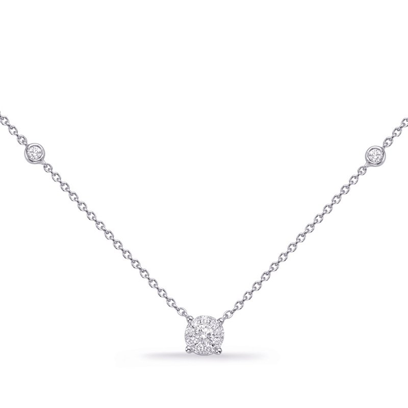 This Necklace is available in 14K White Gold. There are a total of 14 stones. There are Rounds with a total carat weight of 0.27 set in a Bezel Set|Micro Prong|Prong Set setting.