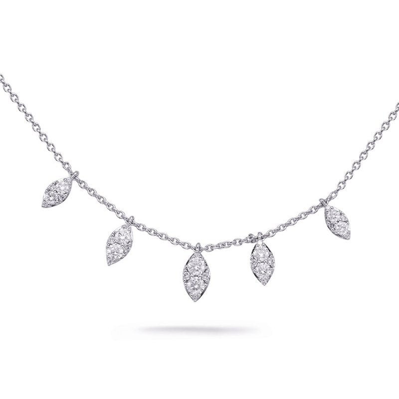 This necklace is available in 14K White Gold. There are a total of 30 stones. There are Rounds with a total carat weight of 0.58 set in a Prong Set setting.None