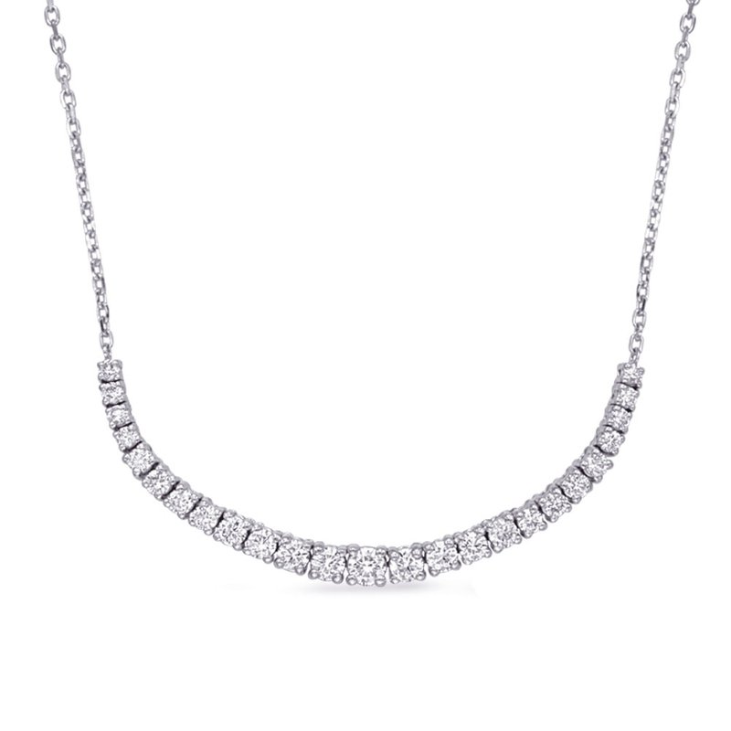 This Necklace is available in 14K White Gold. There are a total of 19 stones. There are Rounds with a total carat weight of 2.04 set in a Prong Set setting.