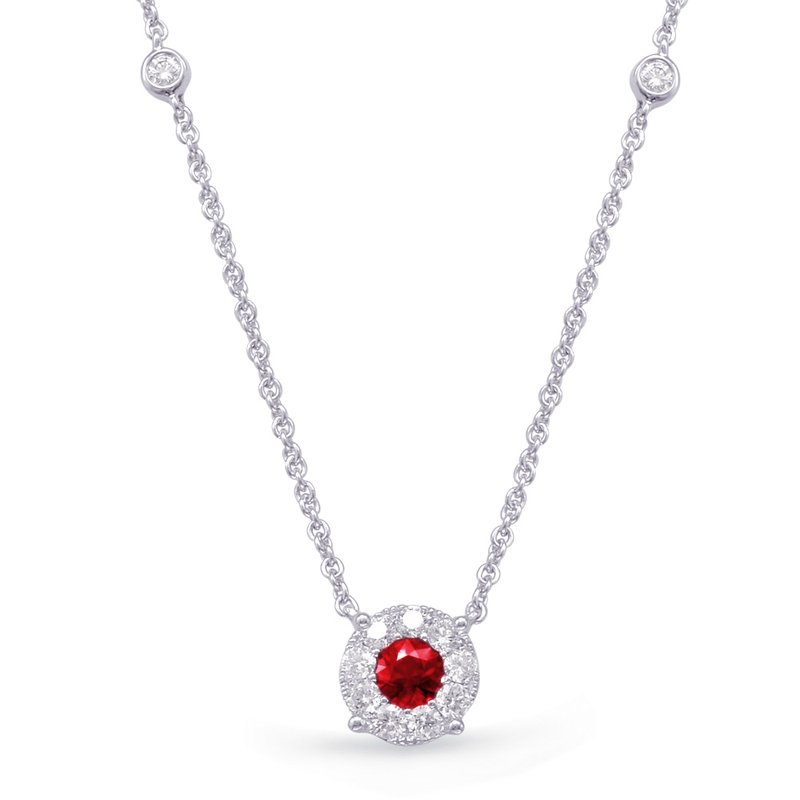 This necklace is available in 14K White Gold. There are a total of 14 stones. There are Rounds with a total carat weight of 0.33 set in a Bezel Set|Micro Prong|Prong Set setting. There are Ruby stones with a toal carat weight of 0.36 set in a Bezel Set|Micro Prong|Prong Set setting.None