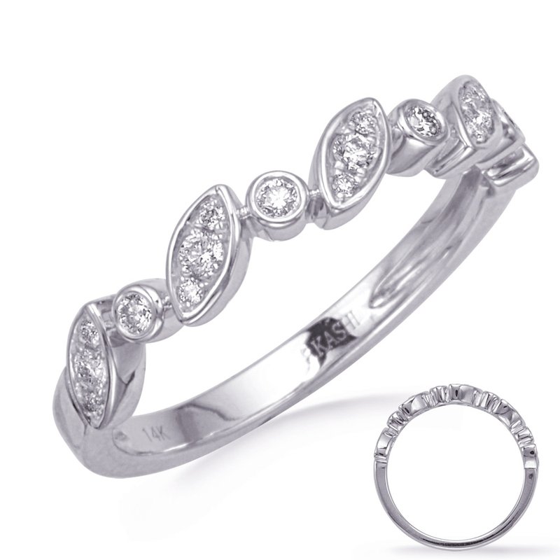 This Band is available in 14K White Gold. There are a total of 19 stones. There are Rounds with a total carat weight of 0.19 set in a Bezel Set|Micro Pave setting.