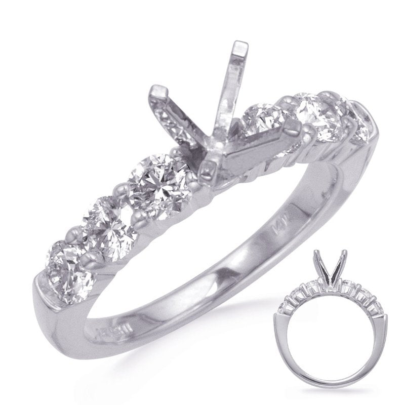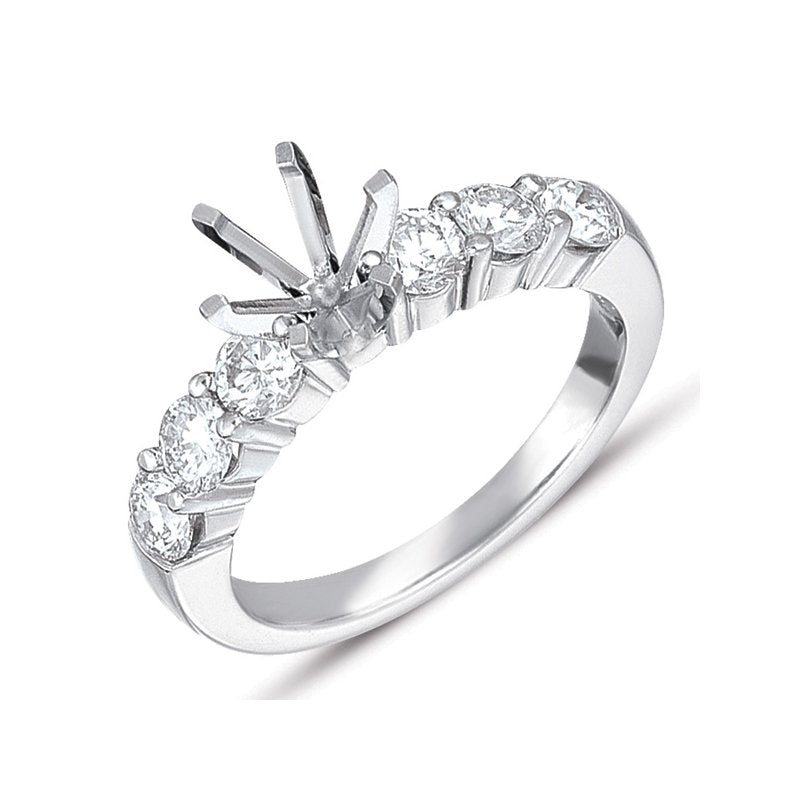 This Engagement Ring is available in 14K White Gold. There are a total of 6 stones. There are Rounds with a total carat weight of 0.96 set in a Prong Set setting.