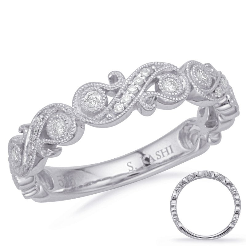 This Band is available in 14K White Gold. There are a total of 21 stones. There are Rounds with a total carat weight of 0.12 set in a Bezel Set|Micro Prong|Shared Prongs setting.
