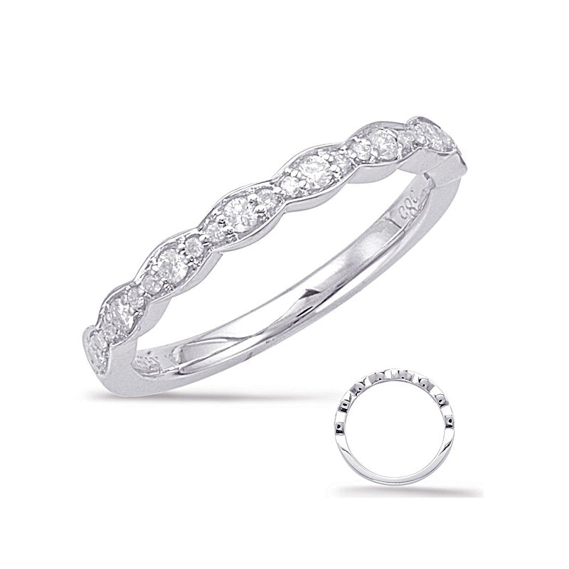 This band is available in 14K White Gold. There are a total of 24 stones. There are Rounds with a total carat weight of 0.18 set in a Micro Prong setting.None