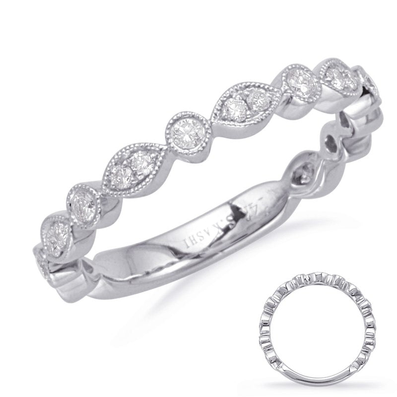 This Band is available in 14K White Gold. There are a total of 20 stones. There are Rounds with a total carat weight of 0.28 set in a Bezel Set|Micro Prong setting.