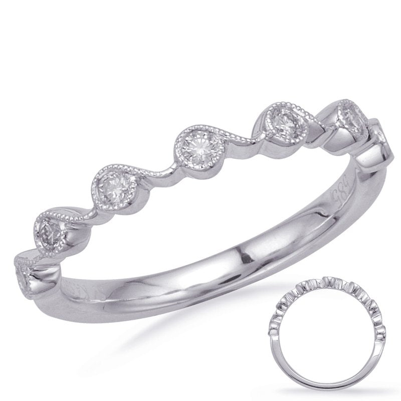 This Band is available in 14K White Gold. There are a total of 7 stones. There are Rounds with a total carat weight of 0.18 set in a Bezel Set setting.