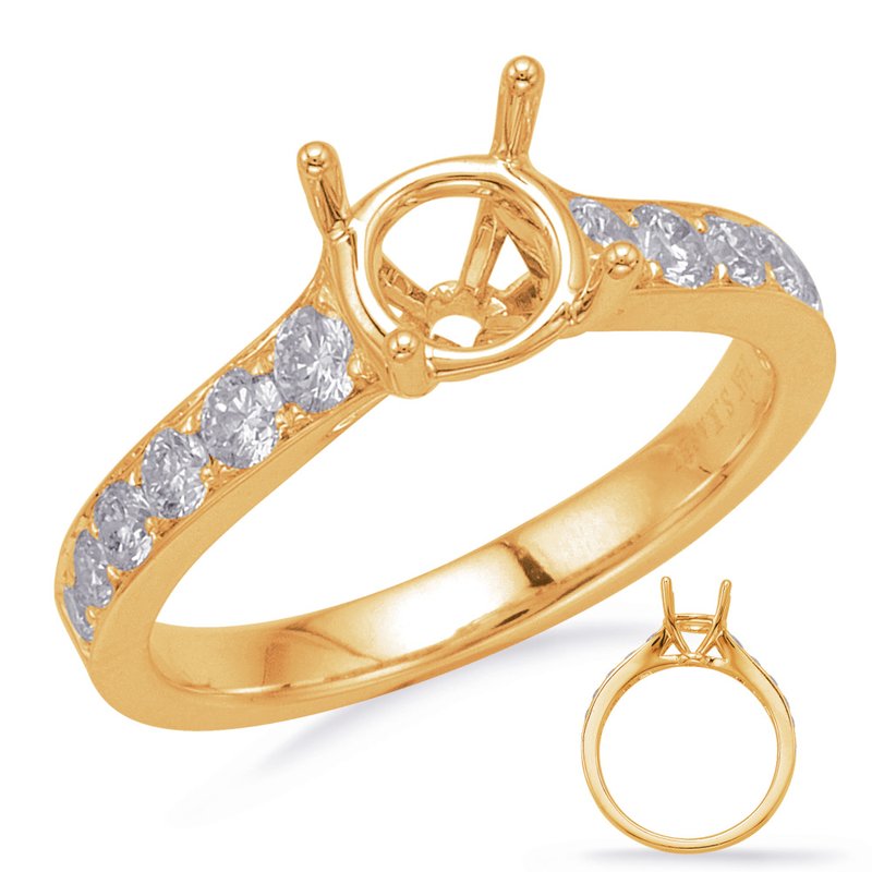 This Engagement Ring is available in 14K Yellow Gold. There are a total of 12 stones. There are Rounds with a total carat weight of 0.55 set in a Channel Set|Micro Prong setting.