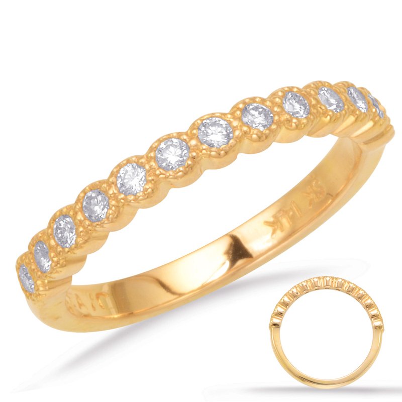 This Band is available in 14K Yellow Gold. There are a total of 13 stones. There are Rounds with a total carat weight of 0.28 set in a Bezel Set setting.None