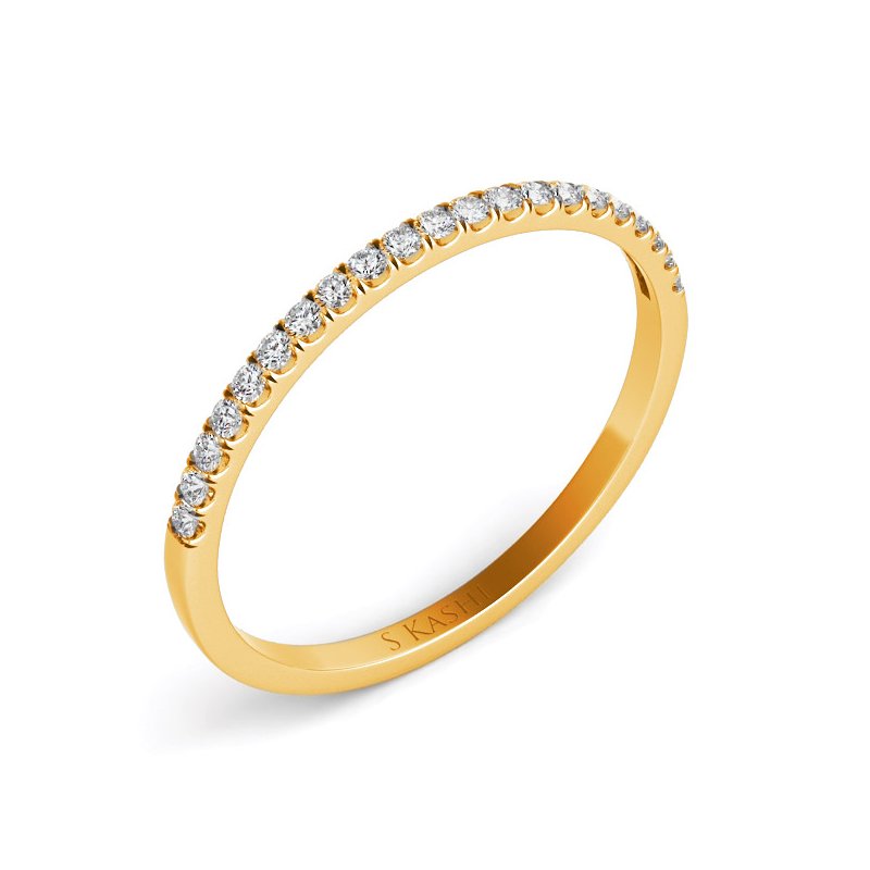 This Band is available in 14K Yellow Gold. There are a total of 21 stones. There are Rounds with a total carat weight of 0.14 set in a Micro Prong setting.
