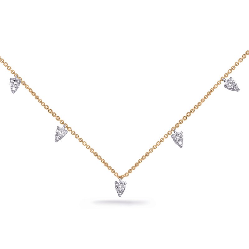 This Necklace is available in 14K Yellow & White Gold. There are a total of 10 stones. There are Rounds with a total carat weight of 0.44 set in a Micro Prong setting.