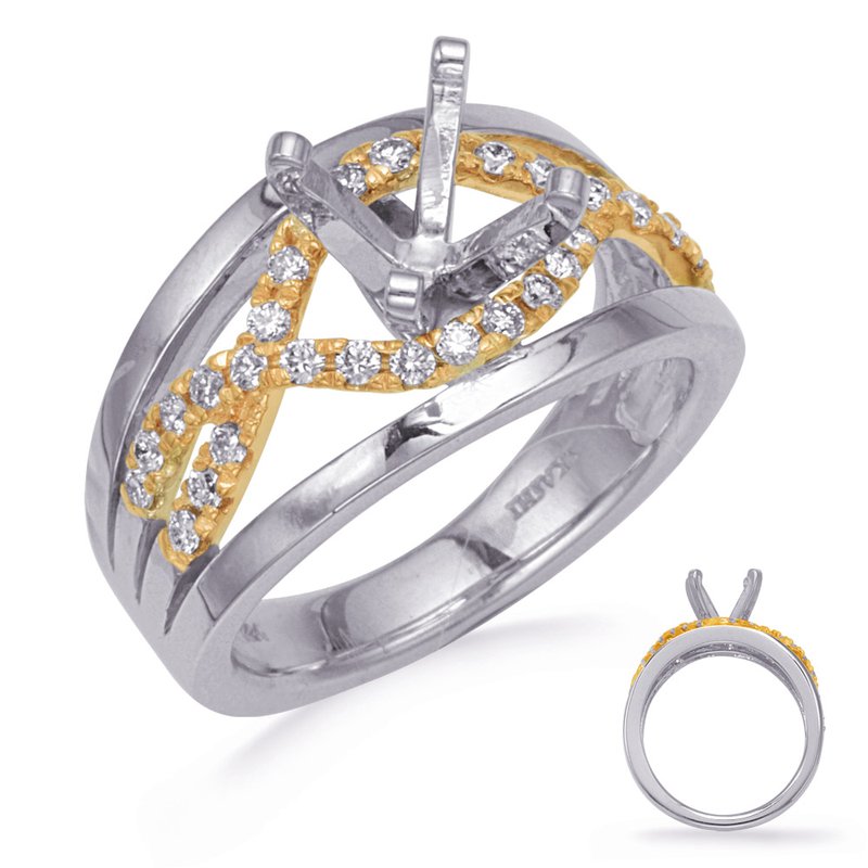 This engagement ring is available in 14K Yellow & White Gold. There are a total of 32 stones. There are Rounds with a total carat weight of 0.38 set in a Micro Pave setting.None
